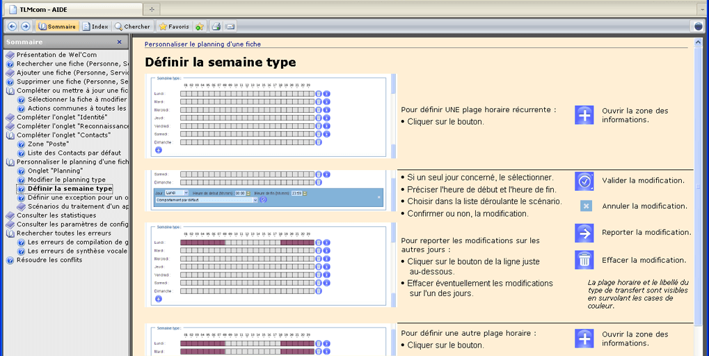 - Chaque page peut être appelée directement à partir de la page du logiciel (depuis un icone ou une touche) afin d'apporter une aide contextuelle à l'utilisateur.